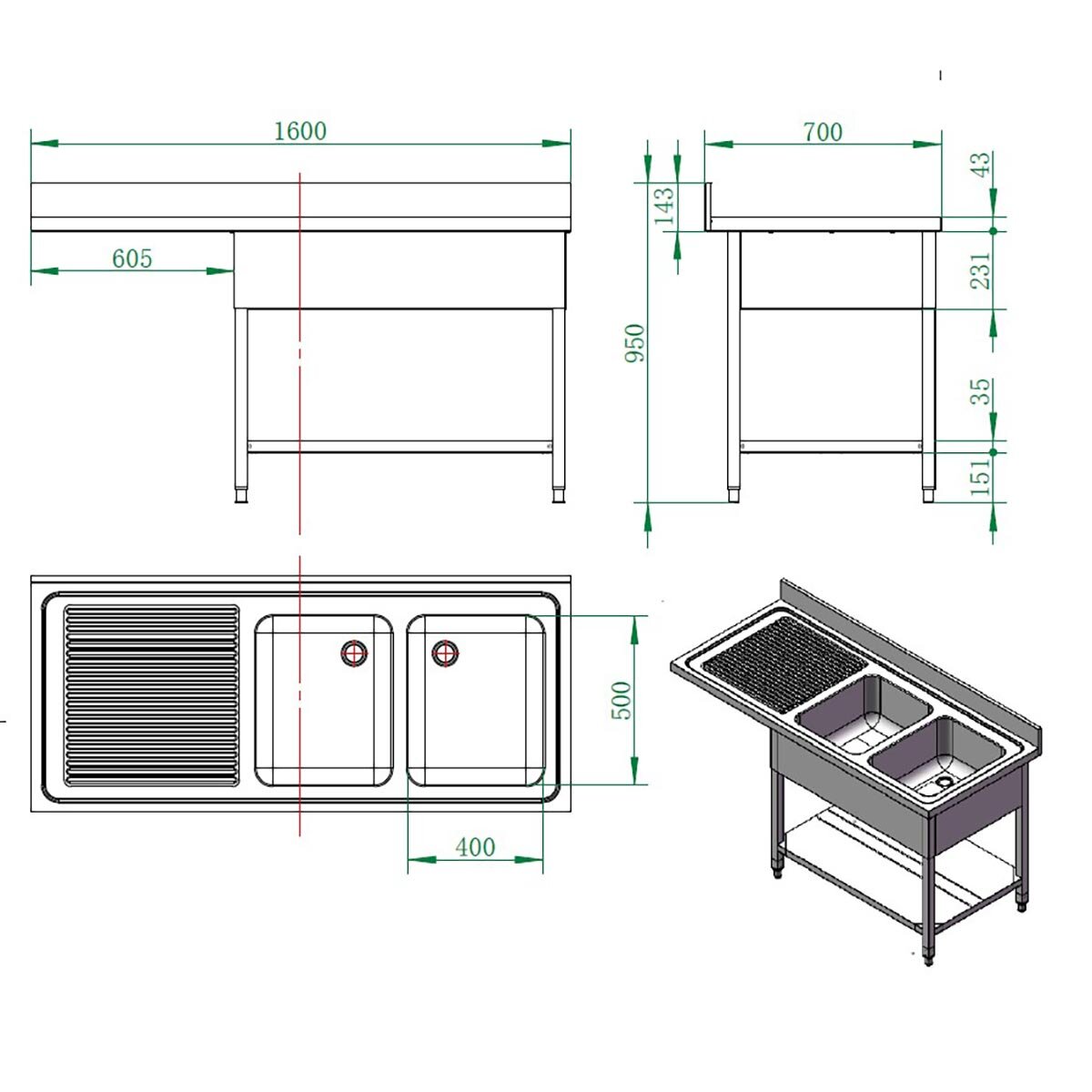 - Anzahl Becken: 2 (rechts angeordnet) mit Abtropffläche links