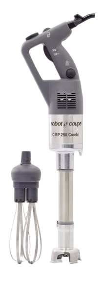 Besonders hervorzuheben ist die vollständig zerlegbare Arbeitsgruppe des CMP 250 Combi. Messer, Mischkopf, Stab und Rührbesen sind aus Edelstahl gefertigt und können zu Reinigungszwecken auseinander genommen werden – ein exklusives Patent von Robot Coupe, das auf maximale Hygiene ausgelegt ist. In Kombination mit dem dreistufigen Dichtungssystem am Stab wird das Eindringen von Flüssigkeit in den Antriebsbereich minimiert und die Lebensdauer des Geräts deutlich erhöht.