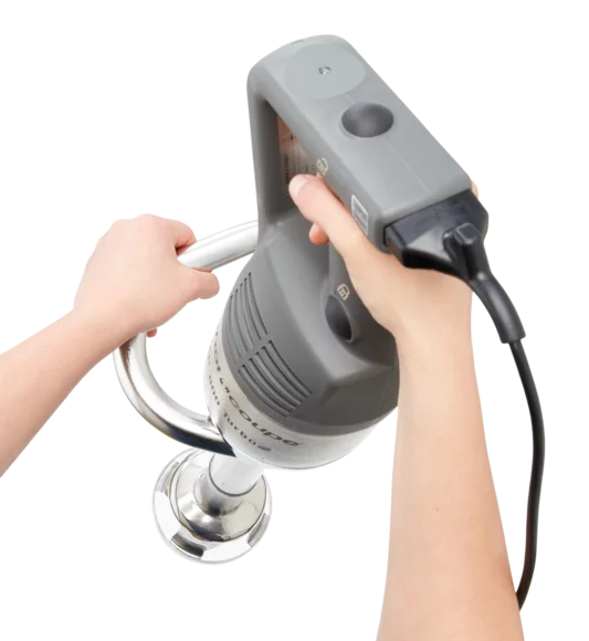 Das Arbeiten mit dem MP 800 Turbo TP ist auf Ergonomie und Sicherheit ausgerichtet. Der Handgriff liegt angenehm in der Hand und ermöglicht eine kontrollierte Führung des Stabmixers auch über längere Zeiträume. Der am Motorblock integrierte Haken dient als Auflage- und Drehpunkt auf dem Topfrand, wodurch das Gewicht des Geräts teilweise abgefangen wird und der Bediener spürbar entlastet wird. Gleichzeitig sorgt die spritzwassergeschützte Konstruktion mit nach oben verlegten Lüftungsöffnungen dafür, dass die Motoreinheit vor eindringender Flüssigkeit geschützt ist – ein entscheidender Faktor für die Zuverlässigkeit des Geräts im harten Küchenalltag.